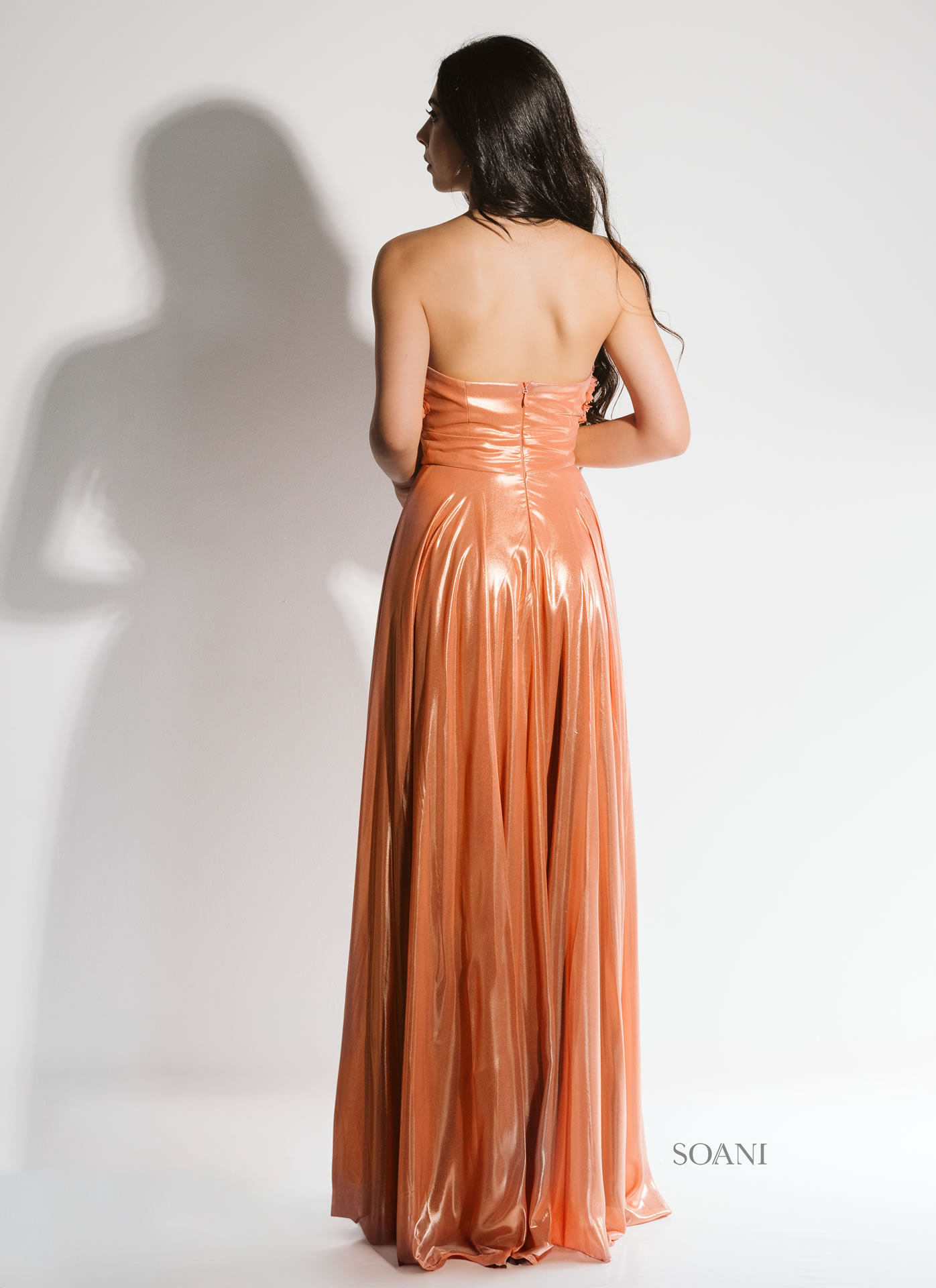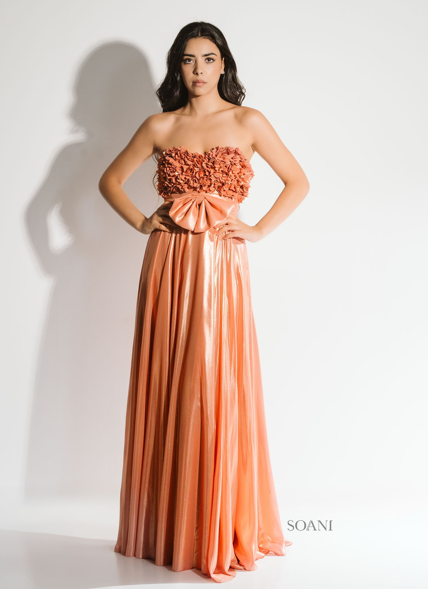 Abito morbido linea ad A in preziosissimo tessuto metal chiffon, i micro fiorellini sul décolleté completano la bellezza di quest’abito che diventa una opzione moderna e romantica