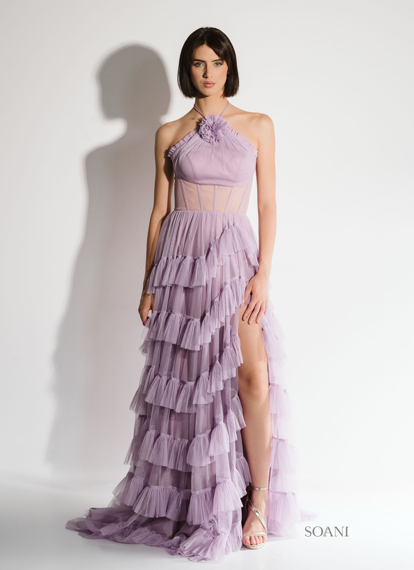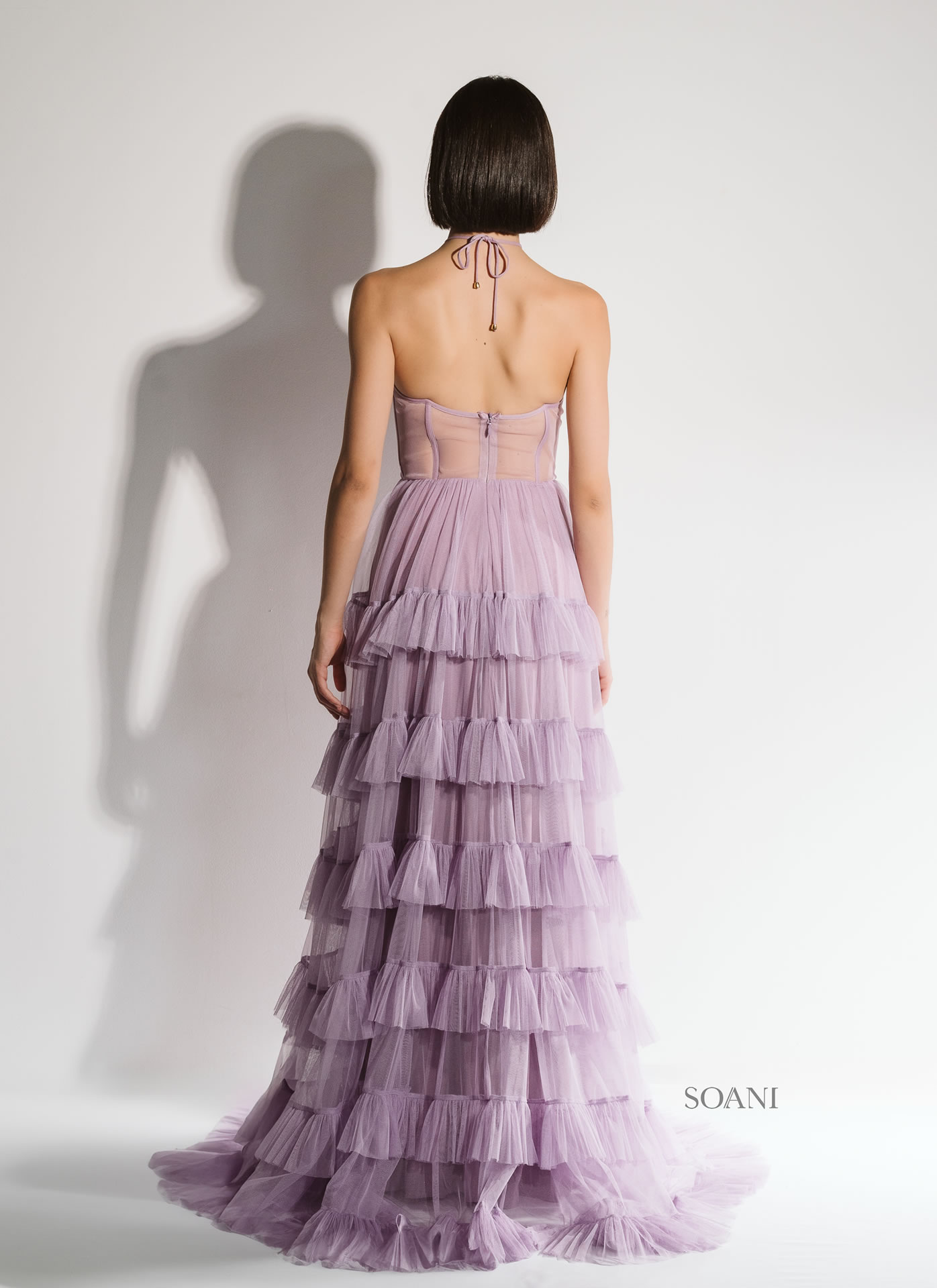 Abito dalla linea morbida in tessuto tulle con mini balze che ne esaltano la preziosa linea e un corpetto steccato che impreziosisce lo stile.