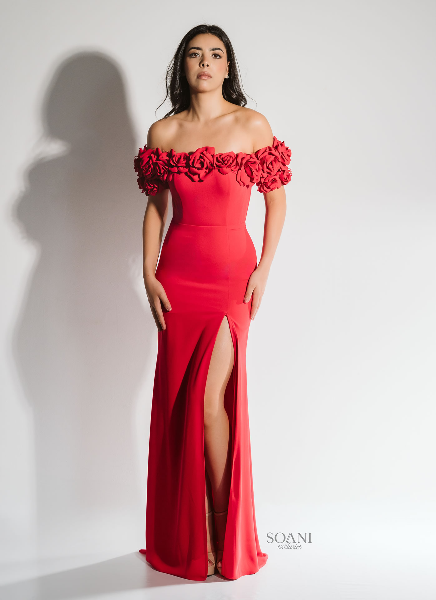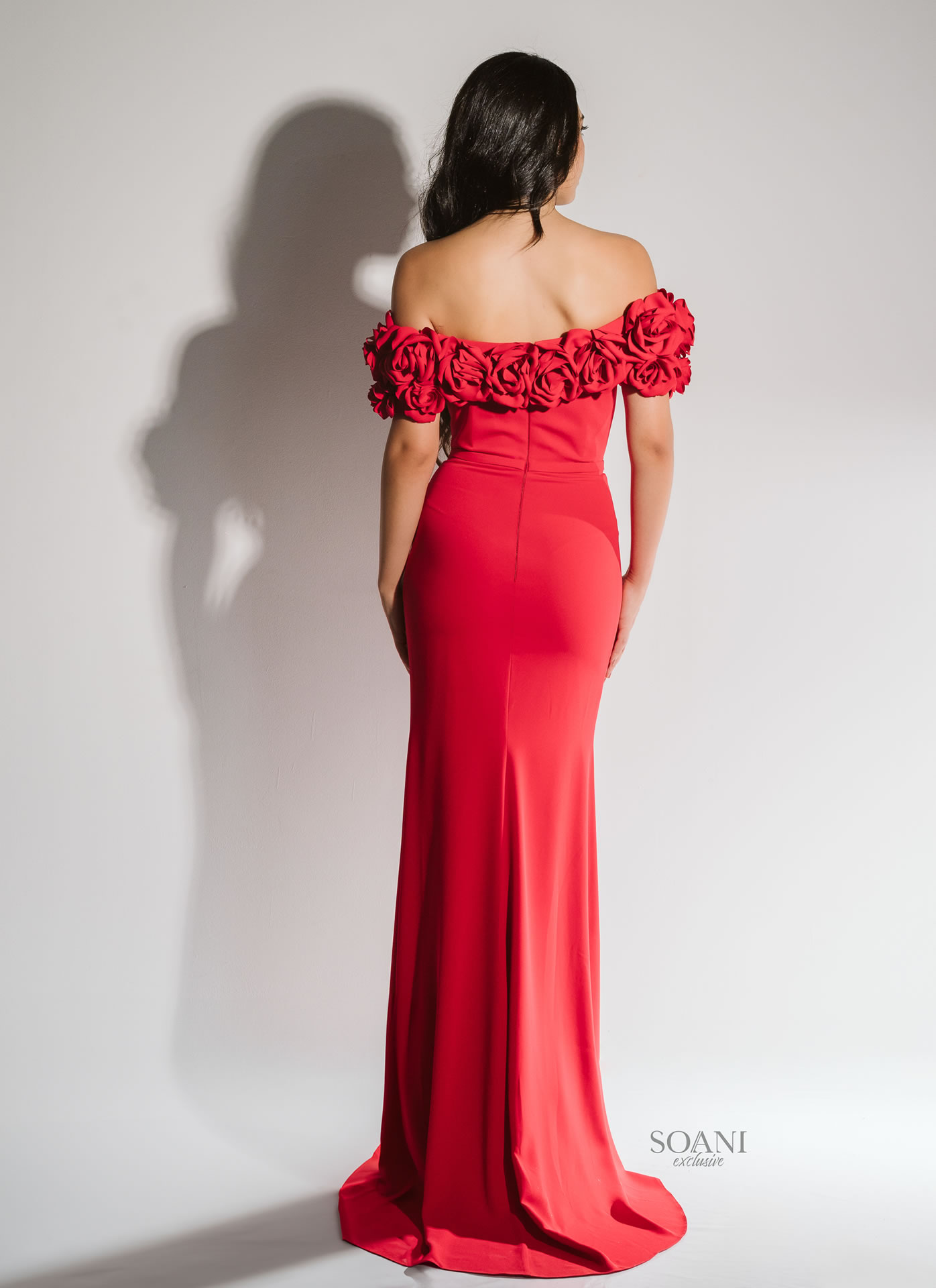 Abito sirena in cady tecnico con bordura omerale di rose, staccabile.